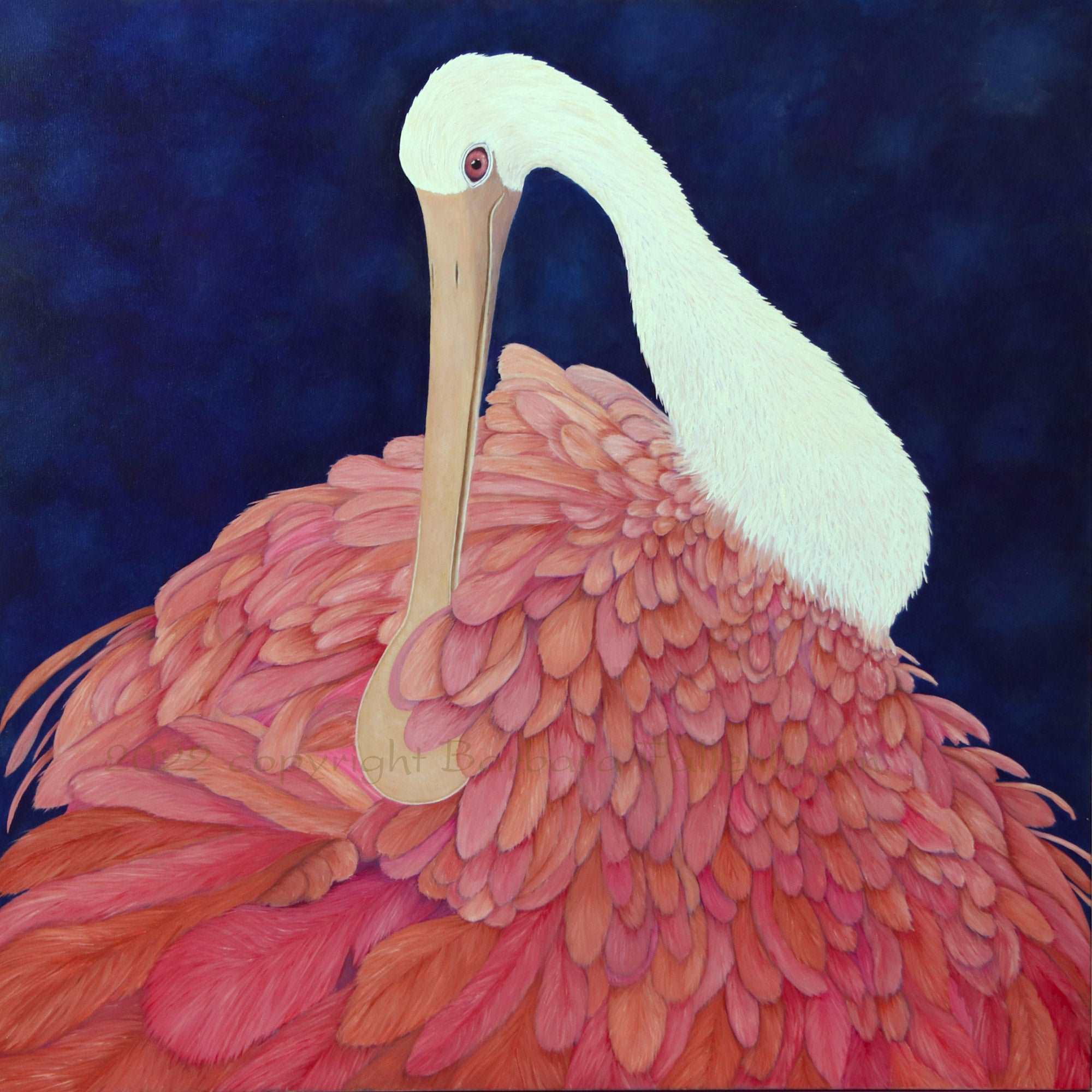 Original Oil painting by Barbara Fallenbaum. They are born naked, helpless and blind. They are usually mature enough to survive and fly away at about 14 weeks. At 7-8 weeks they are mature enough to move around the nest and start preparing to learn how to fly. As they start to grow in their feather, they come in almost white with feathers on the head. As they mature further they start losing the head feathers and their diet influences their coloration turning it from pale pink to almost magenta at times. Saw this little one at Ft. Desoto Park early one morning.